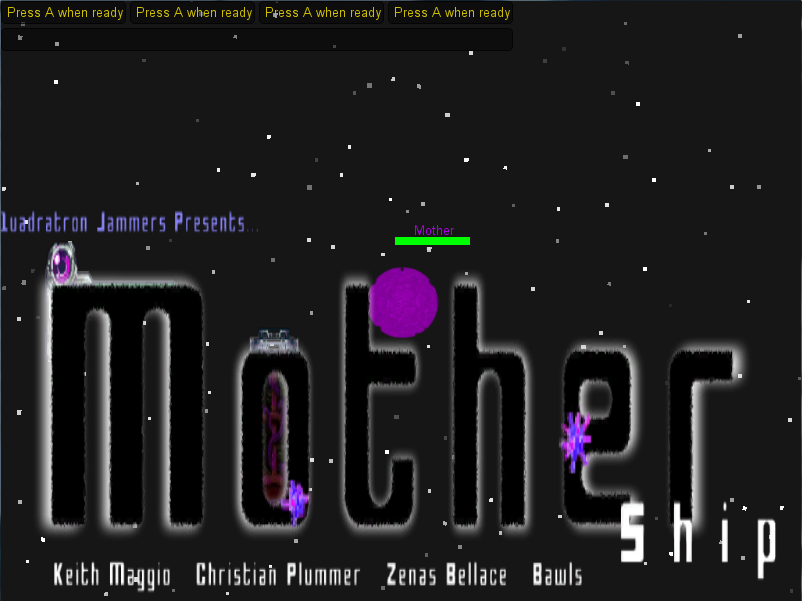 In the end, what matters is that we made a game in less than 48 hours! The theme was “mother” since it was Mother’s Day weekend, and after playing around with some ideas we came up with the idea of a Mothership. Hence the name of our game, Mother(ship). This mother ship is really mothery and clingy, and you have to protect her from aliens. We knew coming in we wanted a semi-casual, 4-player game with co-op, we even brought xbox controllers to plug in. Since Zenas had already started some work on a twin stick shooter (very basics) we decided to stick with that form of basic gameplay. Our artist bailed on us so we went for a simplistic old-school graphics approach which also let us get away with really cheap audio.